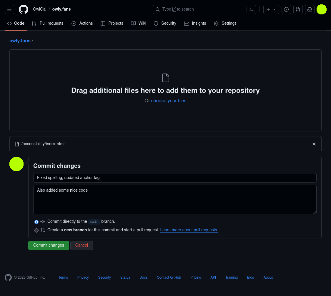 Once you are happy with your changes, there will be a box that says Commit changes, here you can give a title to your changes and write a description of it. Once happy, click on the green button.