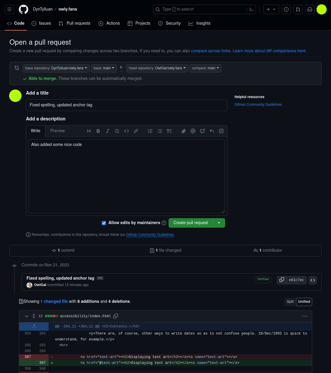 You will once again be redirected to a new page that will show all of the changes that you made to the project. When you send in a PR, other people will also be able to see the changes that you made to the project. Once happy, press the very nice Create pull request button.