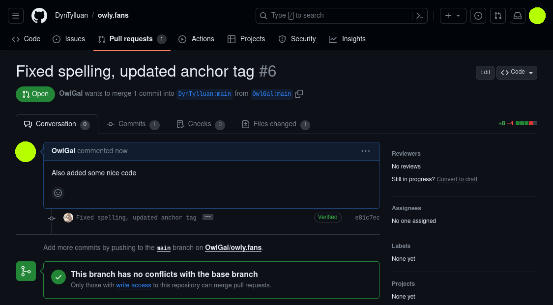 Once you have sent out a new PR, the owner (and also anyone who follows the project) will get an E-Mail and a ping to say that you have sent out this request. On GitHub, there is a comment section on this page where people can talk about your pull.